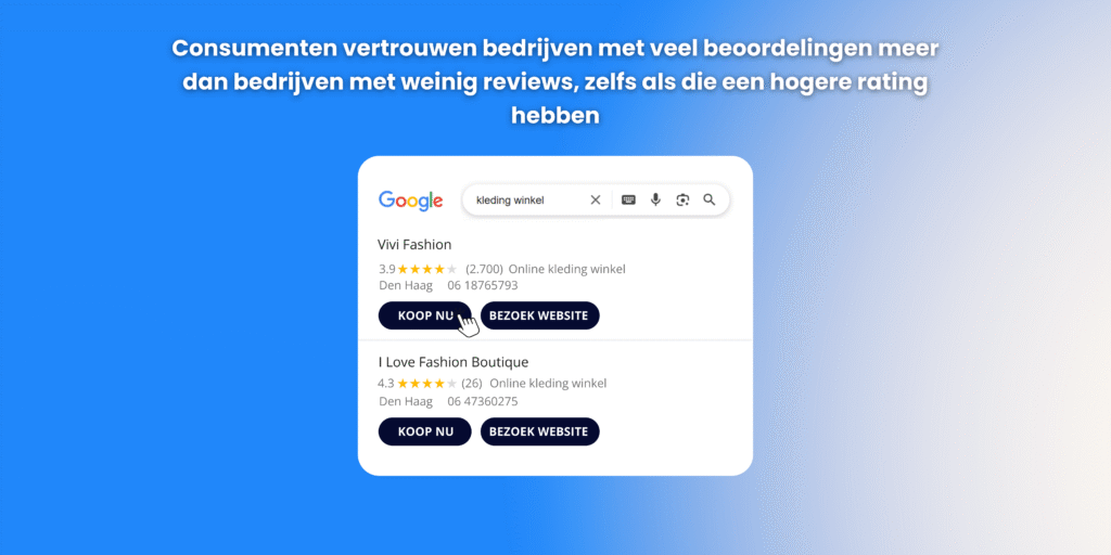 Stel je voor: je zoekt een restaurant. Je ziet er eentje met 4,9 sterren en 12 reviews. En eentje ernaast met 4,3 sterren en 480 reviews. Welke kies je? Grote kans dat je zonder nadenken voor die tweede gaat. En dat is precies waar het om draait.